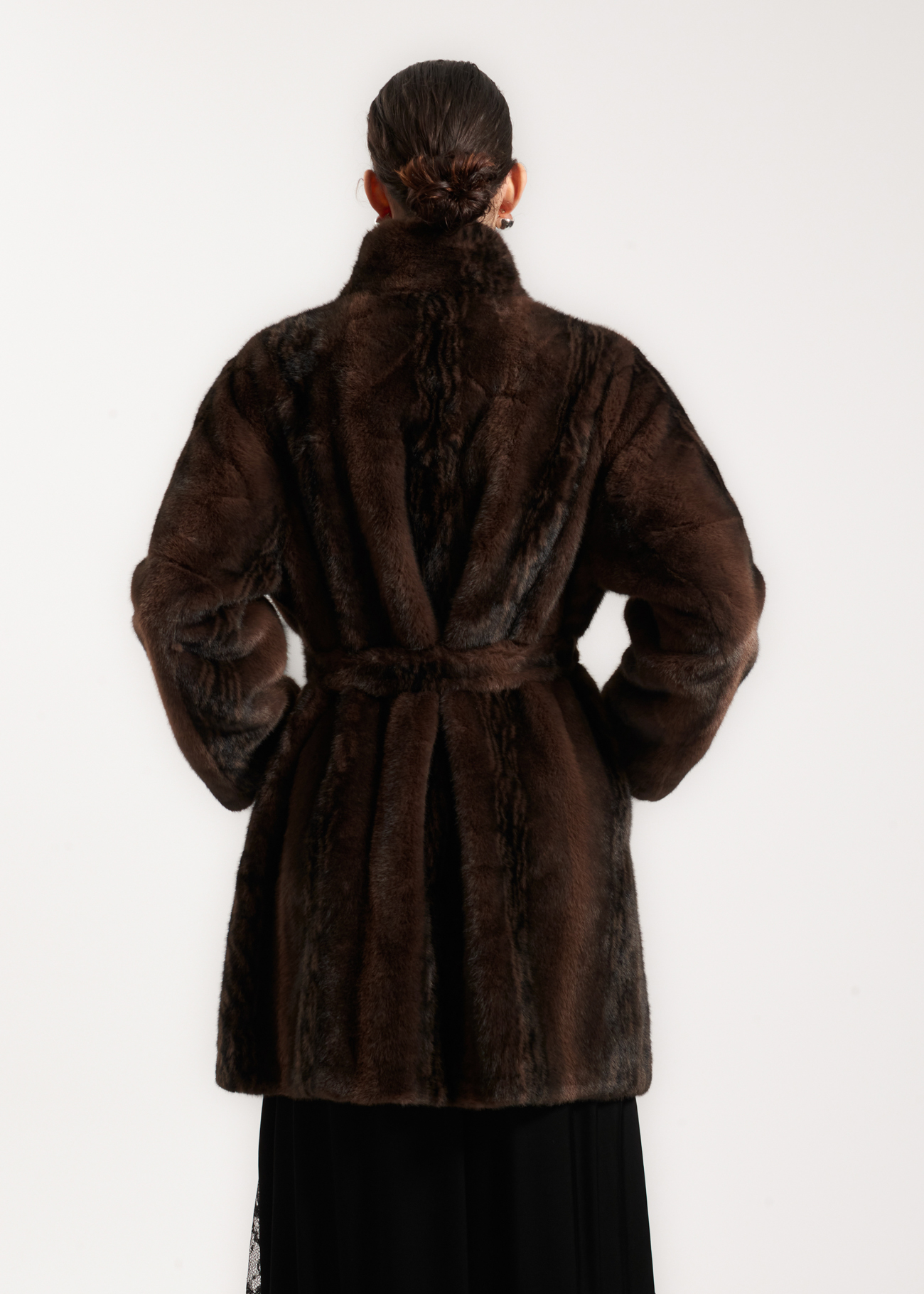 Part of the Christmas Capsule Collection, the Allegra Coat captures the essence of winter sophistication with its soft, coffee toned faux fur and delicate gradient patterning. Featuring a high, effortless stand collar and a tonal self tie belt that cinches the waist, it exudes both warmth and refinement. The smooth texture and subtle depth of the color create a luxurious visual richness, while the relaxed yet sculpted silhouette ensures timeless elegance. Perfect for layering over eveningwear or tailored looks, the Allegra Coat embodies contemporary glamour with an understated allure.