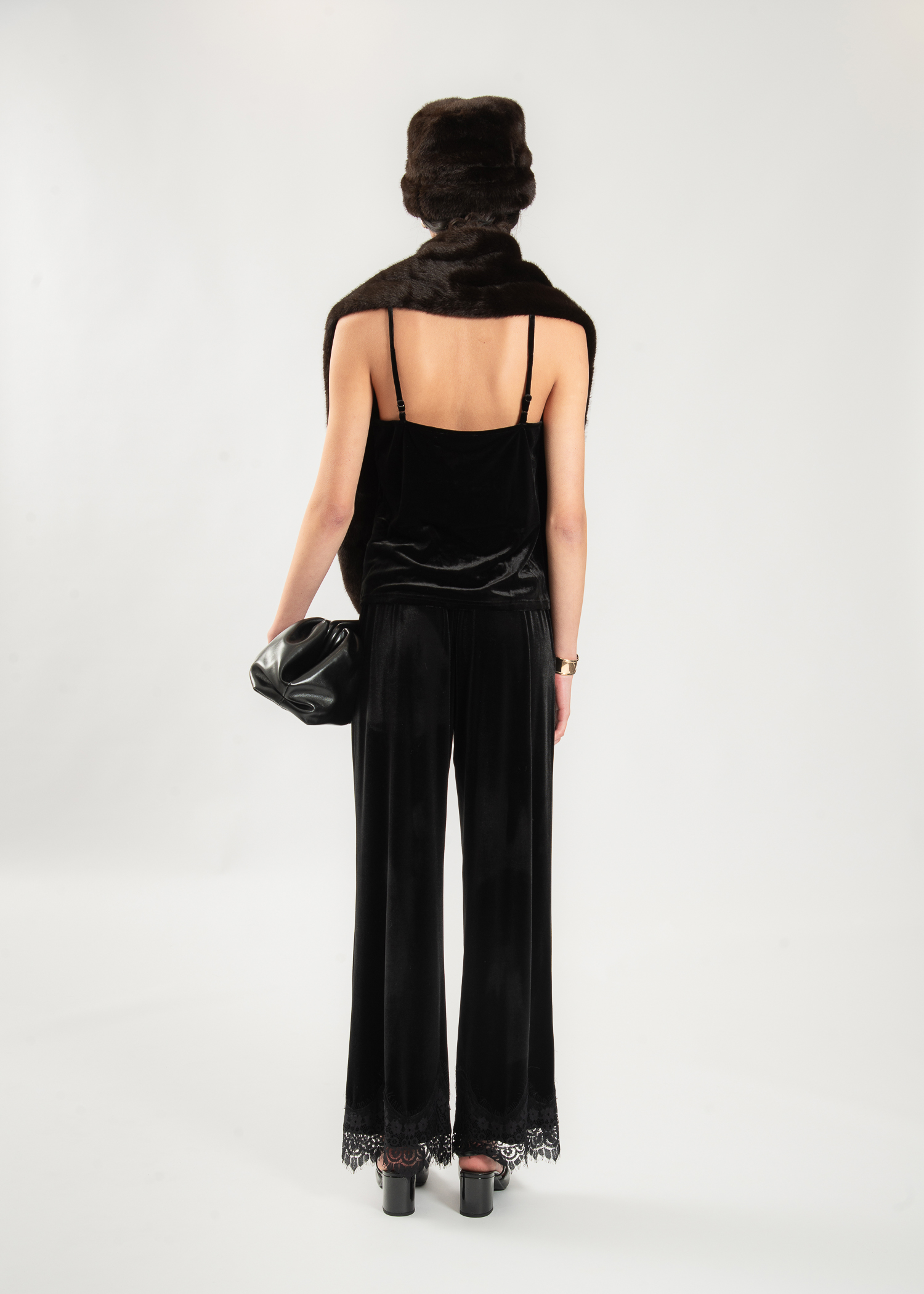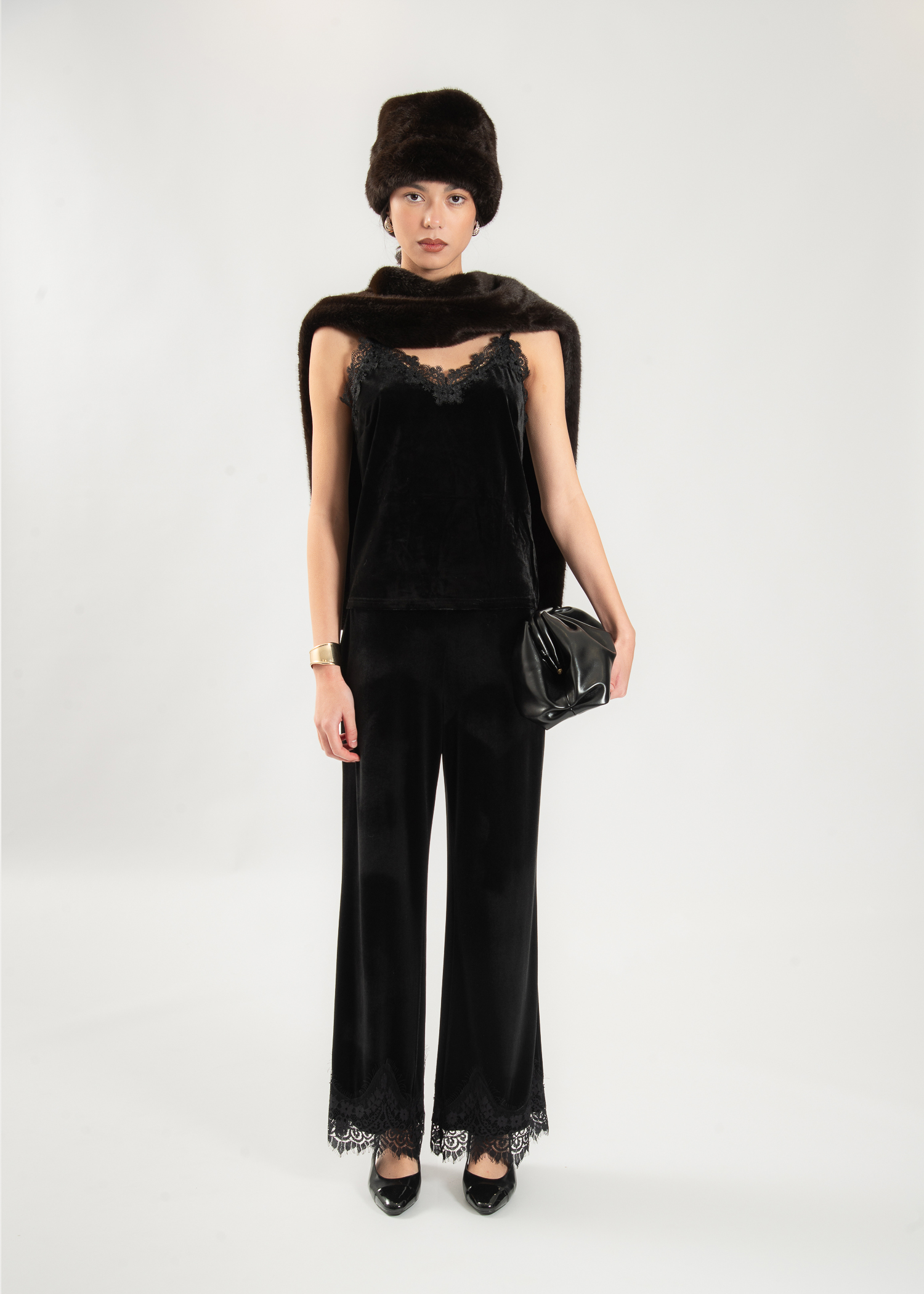 Both the camisole and trousers are crafted from a sumptuous velvet blend (97% Polyester, 3% Elastane) that provides a rich, plush texture and just the right amount of stretch for a comfortable, flattering fit. The velvet camisole features delicate spaghetti straps and a beautiful black lace trim along the V neckline, adding a hint of feminine allure. The wide leg trousers complement the top with their flowing drape and are finished with a matching lace trim detail at the hem, creating continuity and an incredibly chic effect, especially when paired with heels. Designed to be worn together for a monochromatic statement or mixed and matched, this set captures timeless evening elegance.
