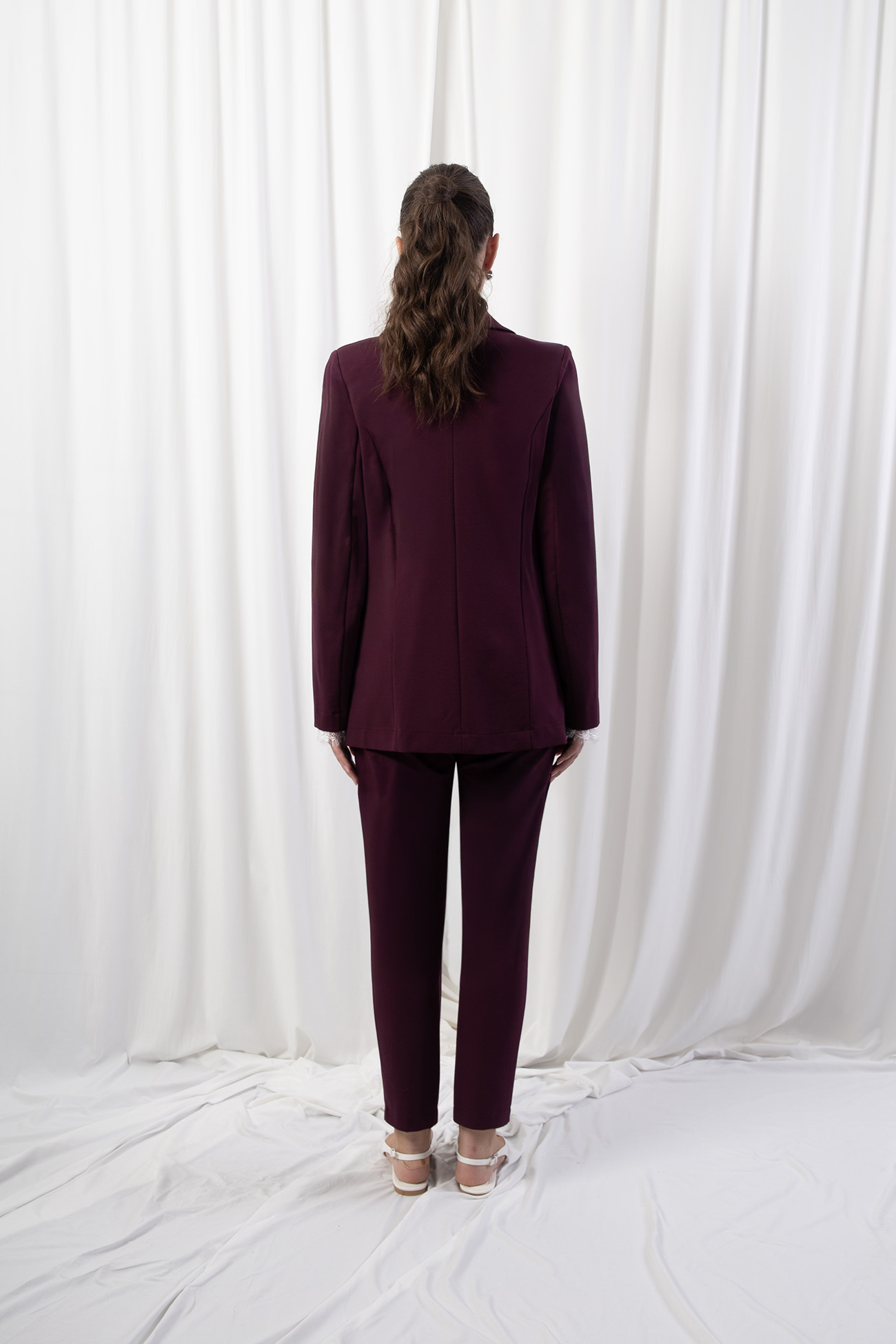 A refined burgundy tailored suit that blends timeless elegance with contemporary sophistication. The single-breasted blazer features a sharp lapel, a single-button closure, and clean lines that elongate the silhouette. Paired with slim tailored trousers designed for a sleek, structured fit, this ensemble offers effortless versatility from polished office attire to evening sophistication. Crafted from a premium viscose-blend fabric with added stretch, it ensures comfort, flexibility, and a flawless drape. An empowering choice for the modern woman who values style with substance.