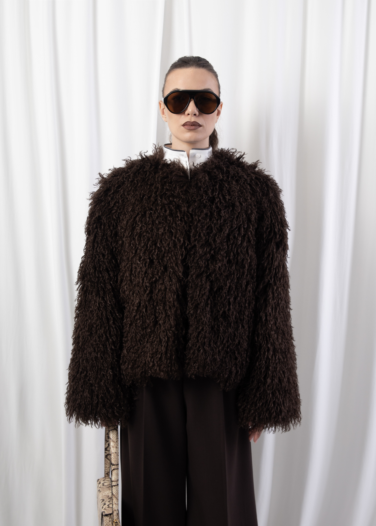 Elevate your cold-weather wardrobe with the Chocolate Brown Mongolia Fur Jacket, designed in a plush faux-fur texture for maximum warmth and modern sophistication. Its rich, deep brown tone makes it a versatile layering piece that adds both luxury and edge to any outfit. Cut in a relaxed silhouette with a timeless appeal, this jacket pairs effortlessly with tailored trousers, skirts, or denim, transitioning seamlessly from daywear to evening chic.