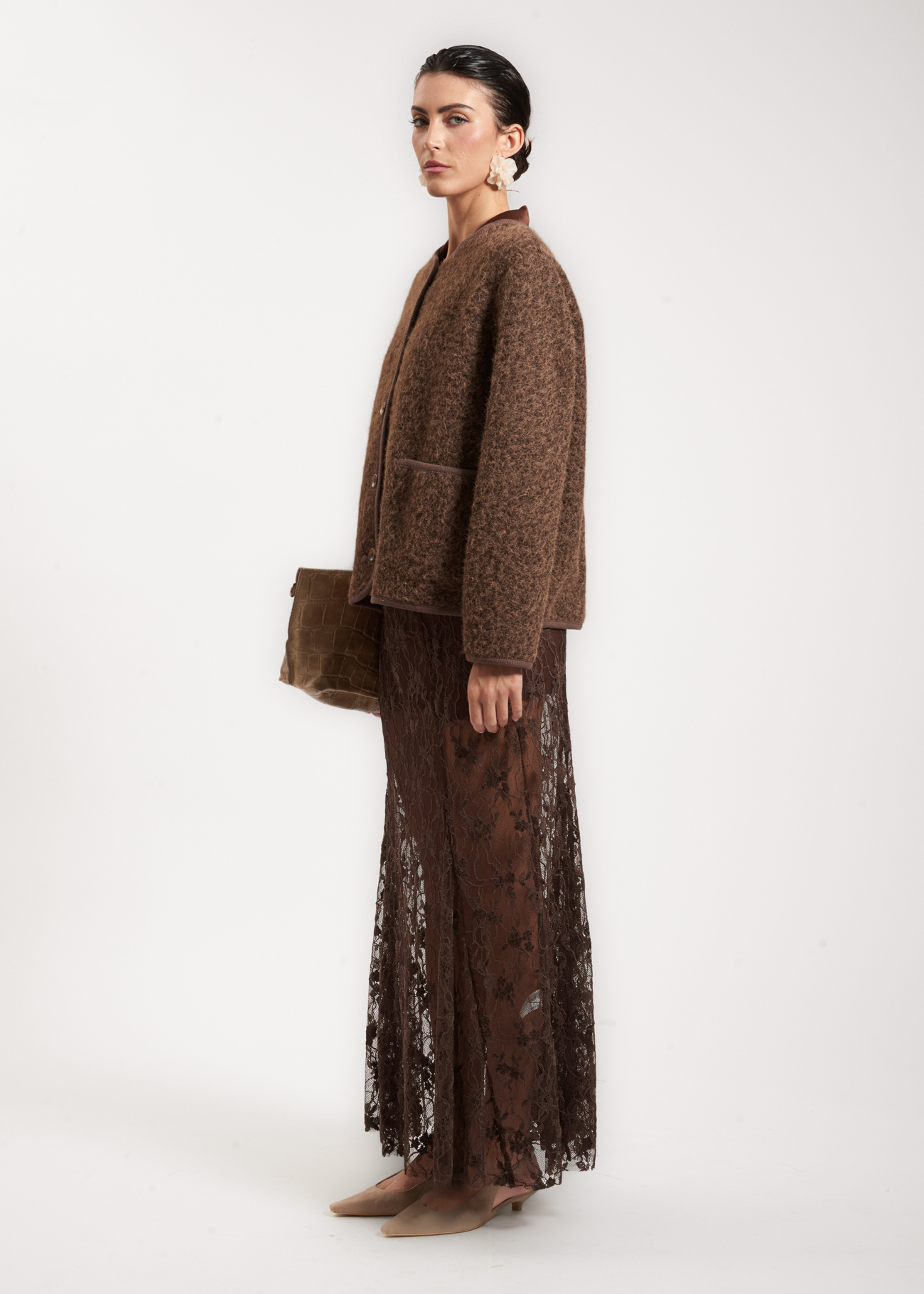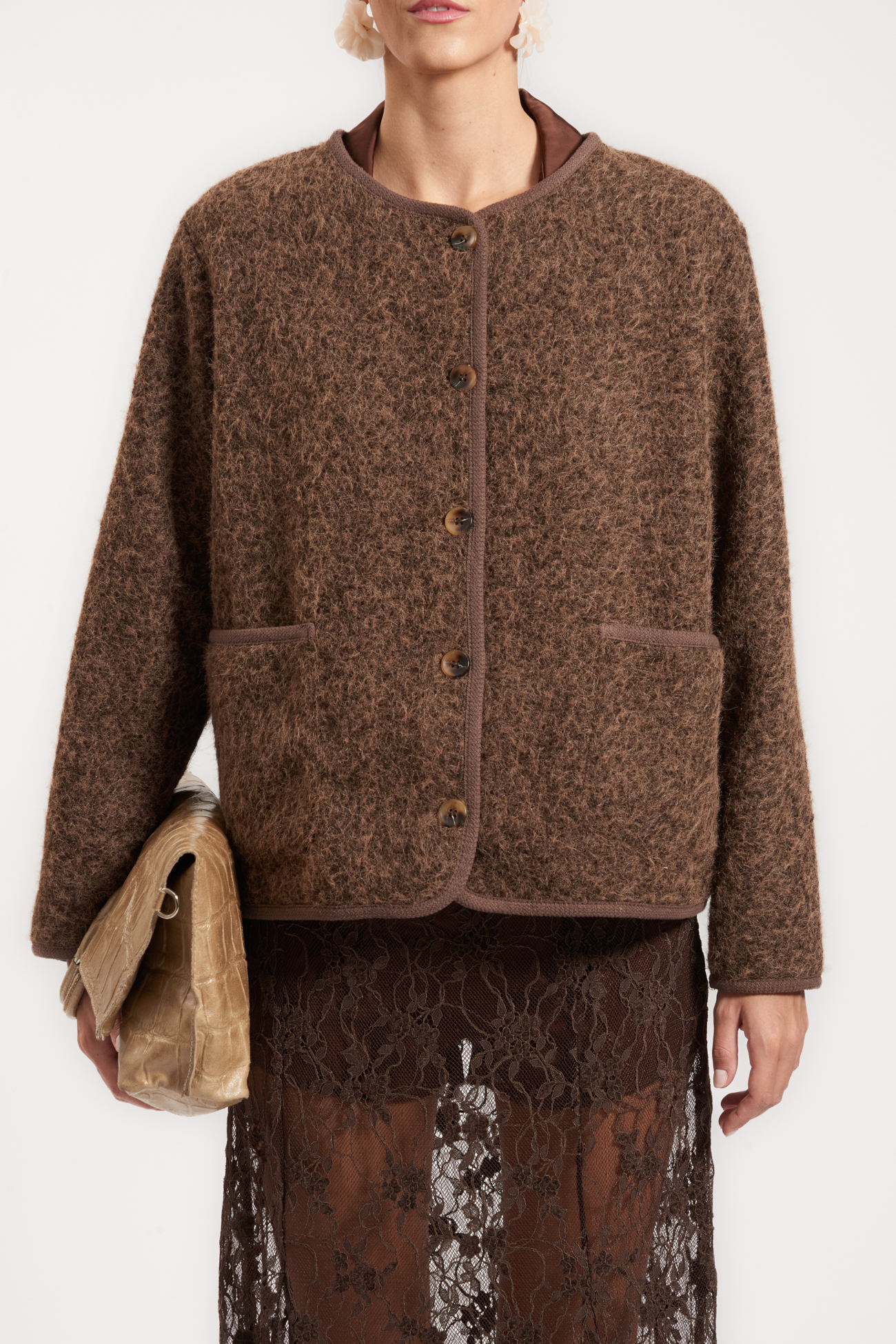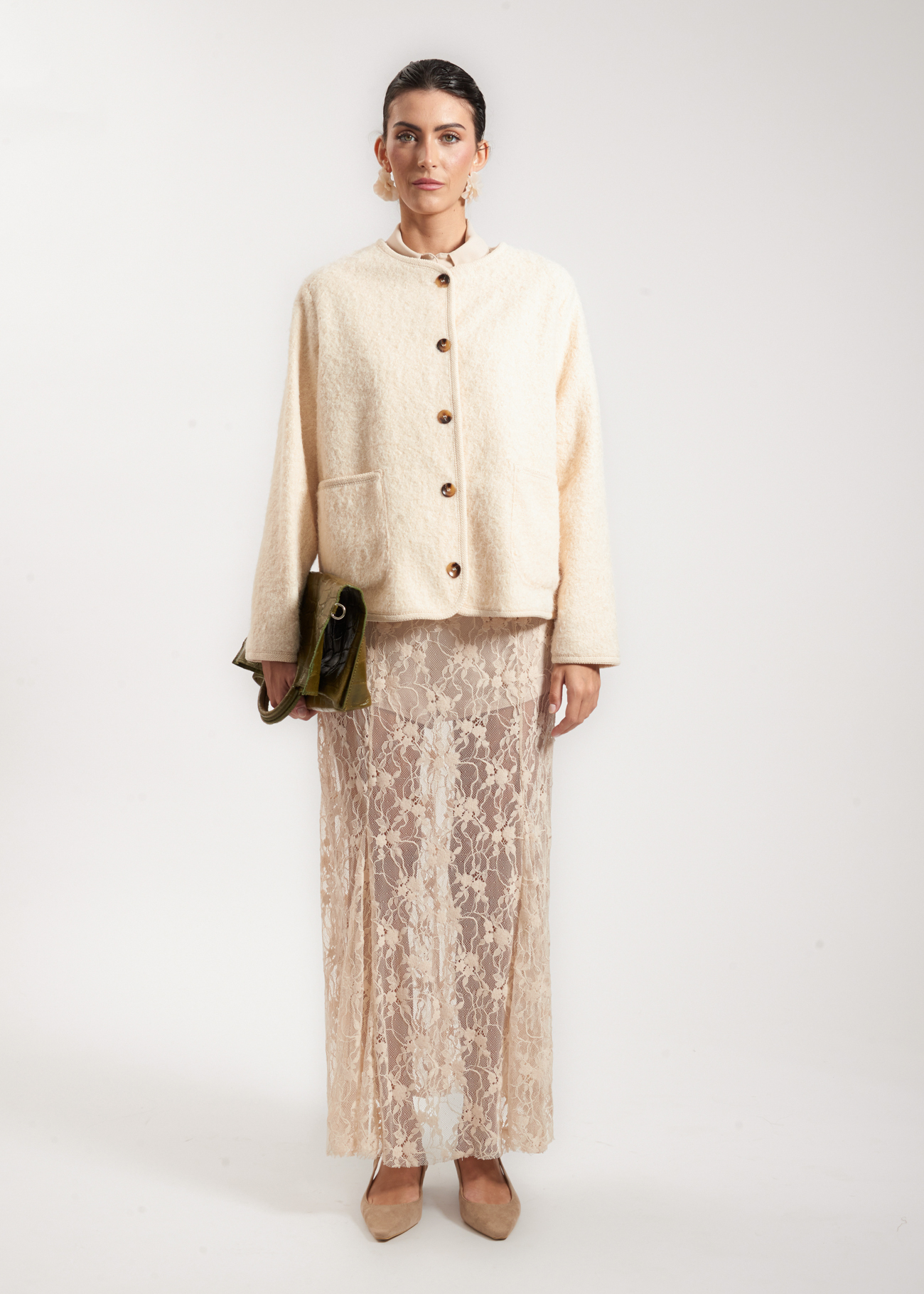 Cut in a relaxed, boxy silhouette, it features a rounded neckline, front button closure, and practical patch pockets a nod to effortless functionality. The soft brushed texture enhances its warmth and comfort, while the tonal edging refines its clean finish.Perfect for layering over evening lace or everyday tailoring, it transitions seamlessly between laid-back elegance and modern polish.