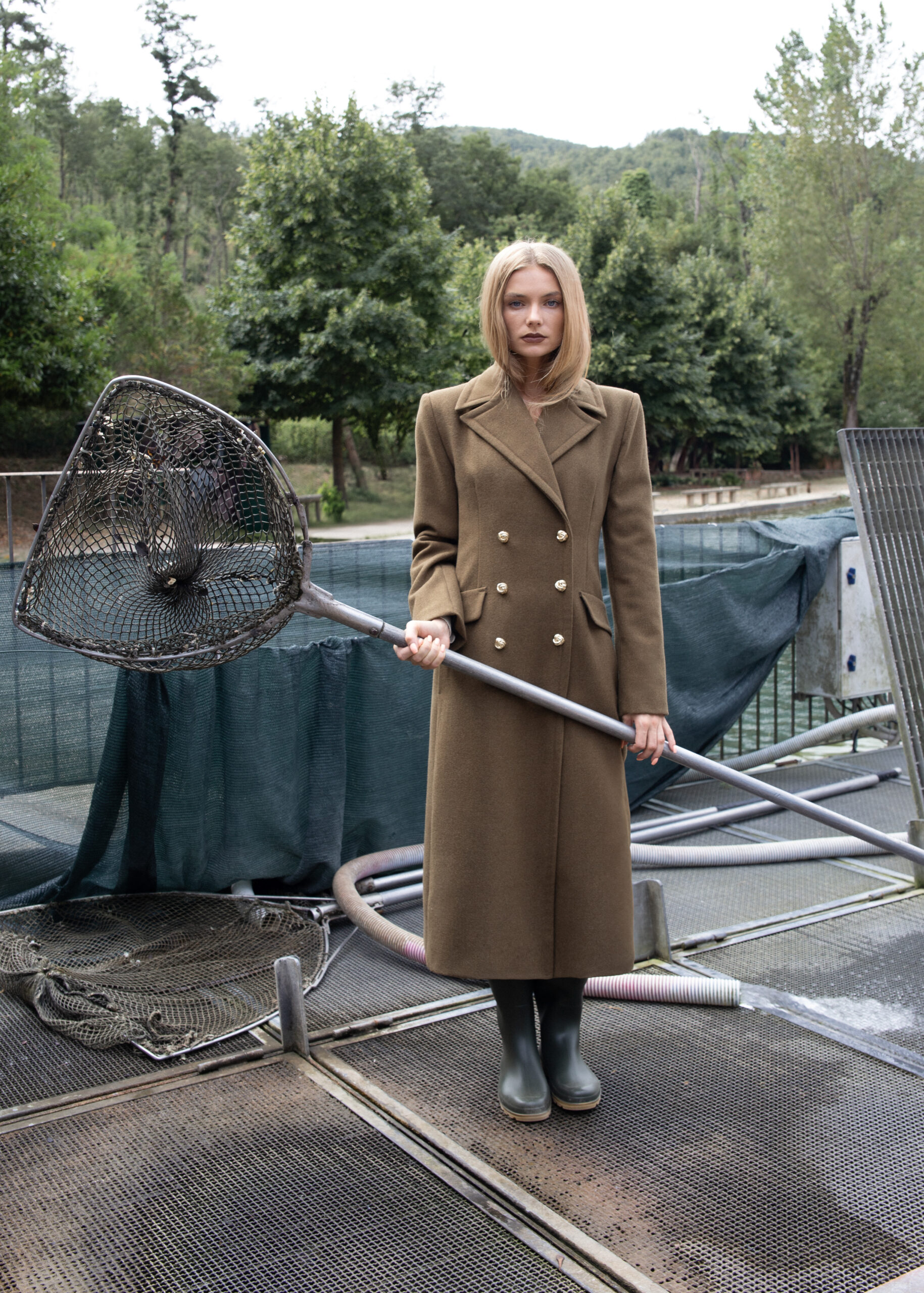 A longline double-breasted coat that merges timeless tailoring with contemporary refinement. Crafted from a premium wool blend, it features structured shoulders, peak lapels, and gold-tone buttons that emphasize its sophisticated silhouette. The tailored cut enhances the figure while maintaining comfort, making it a versatile piece for both formal and everyday wear. Finished with flap pockets and a back vent for ease of movement, this coat embodies understated elegance and durability.