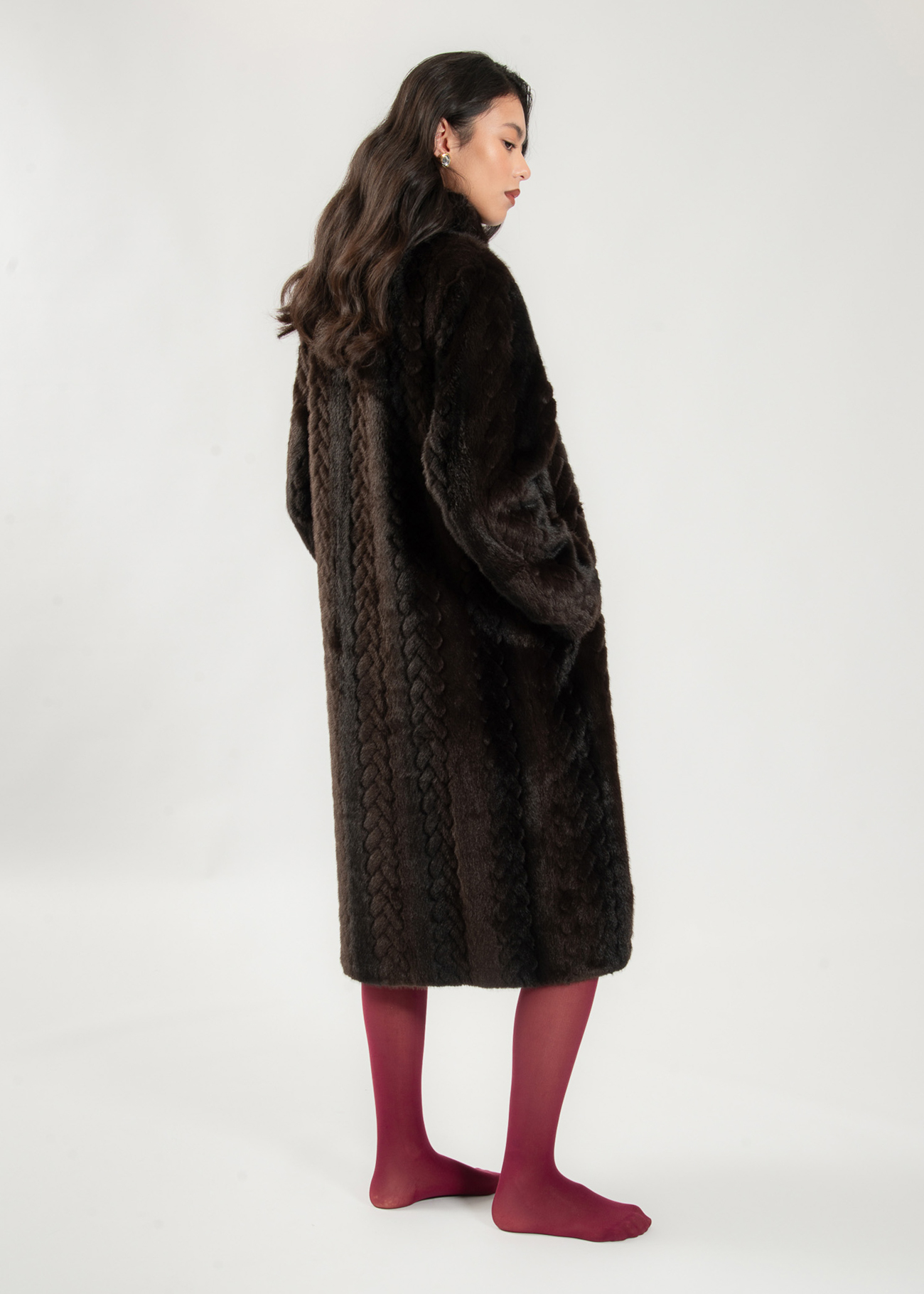 This coat stands out with its unique braided or chevron pattern, meticulously woven into the rich, dark brown faux fur. This intricate texture adds depth and sophistication, distinguishing it from standard outerwear. The silhouette is long and flowing, falling to the mid-calf, offering exceptional warmth and a dramatically chic profile. A subtle high collar ensures extra protection and a touch of refined structure. Whether layered over evening wear for a gala or paired with everyday denim for a luxurious lift, this faux fur coat guarantees a cozy feel and a show-stopping look.