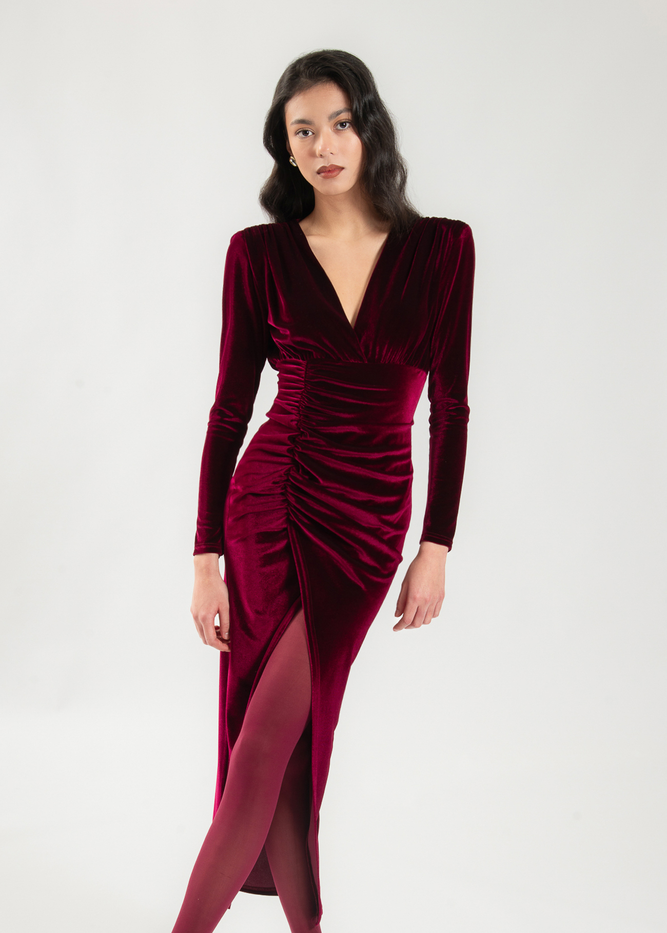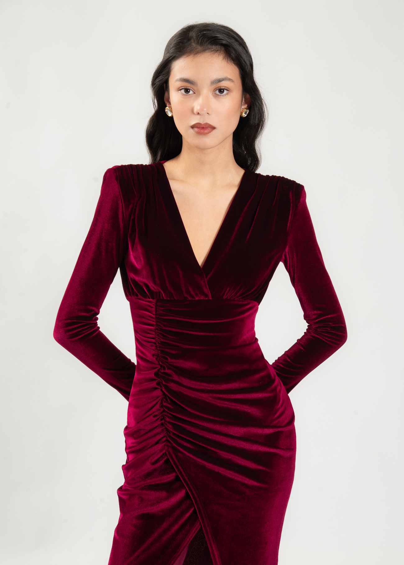 The design features a sophisticated deep V-neckline and long, sleek sleeves that lend a touch of timeless refinement. The true highlight lies in the meticulously placed ruching and gathering across the bodice, which enhances the waistline and creates a flattering, figure-hugging profile. Finished with an elegant front slit, this piece perfectly balances classic glamour with modern confidence. It is the definitive choice for the woman seeking a truly unforgettable evening dress.