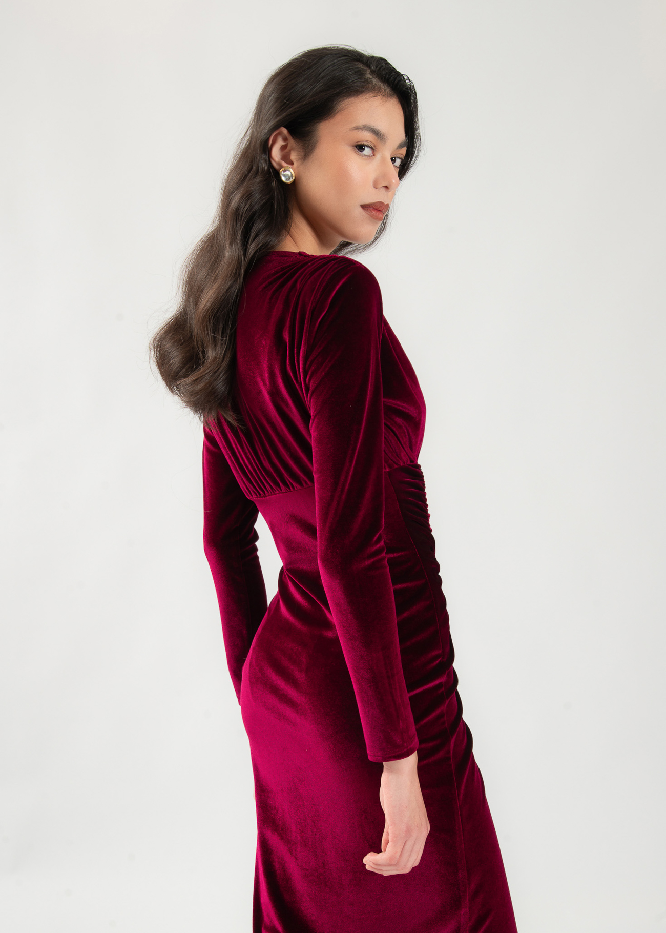 Elevate your holiday and evening wear with this exquisite Burgundy Velvet Long Sleeve Dress, a standout piece from our most cherished capsule collection. This dress is a true celebration of feminine allure and luxurious texture, designed to ensure you captivate attention at any event.