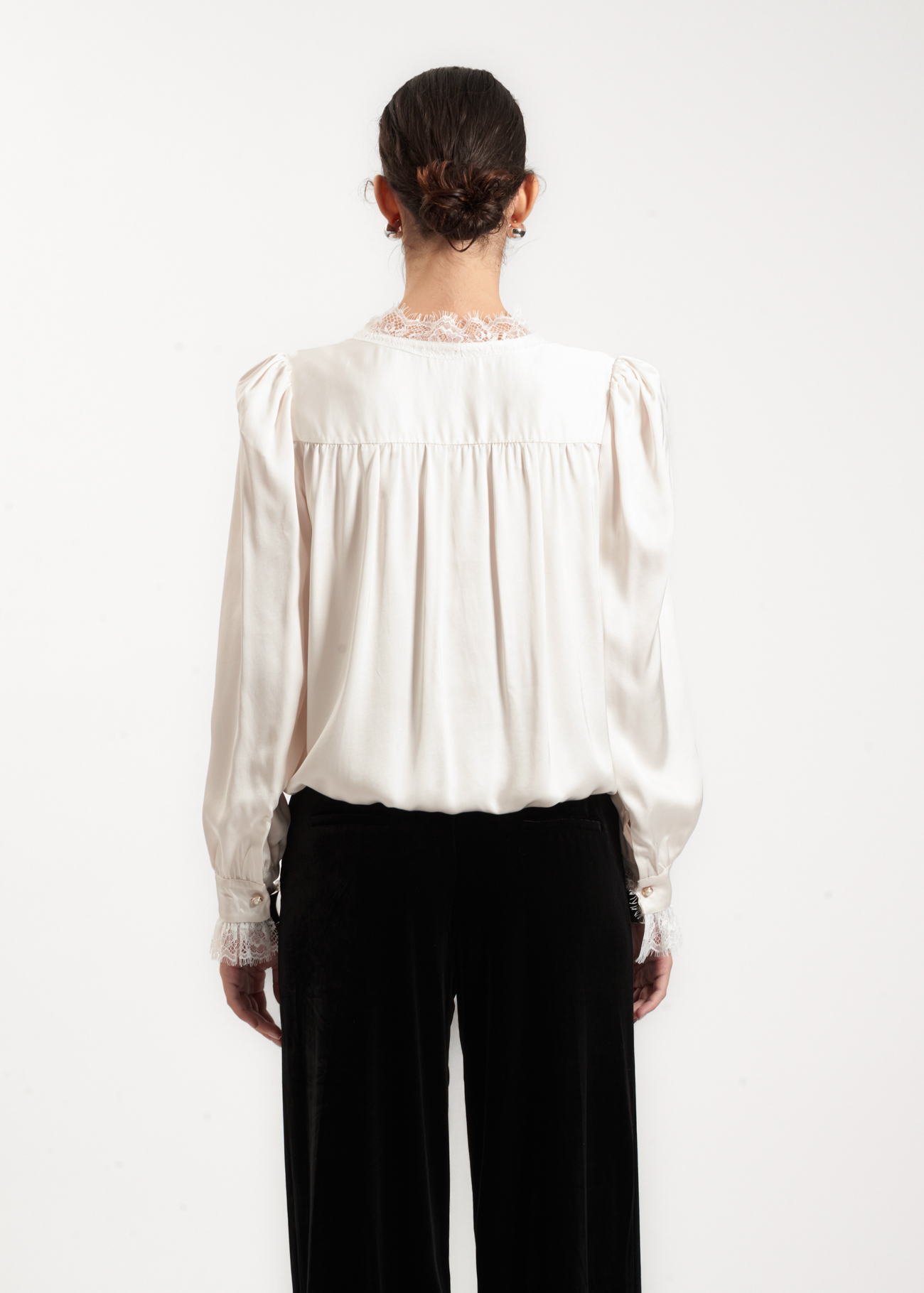 The Ivory Lace Muse Blouse captures the essence of understated elegance. Crafted from a fluid viscose fabric with a delicate sheen, it drapes gracefully over the body, offering a soft, romantic silhouette. The deep V neckline is framed with fine lace trim, mirrored on the cuffs, adding a subtle touch of vintage femininity. Perfectly balanced between sensuality and sophistication, this blouse transitions effortlessly from daytime refinement to evening allure ideal paired with high waisted velvet trousers or a tailored skirt.