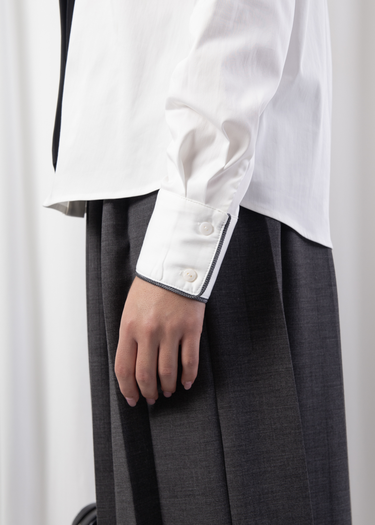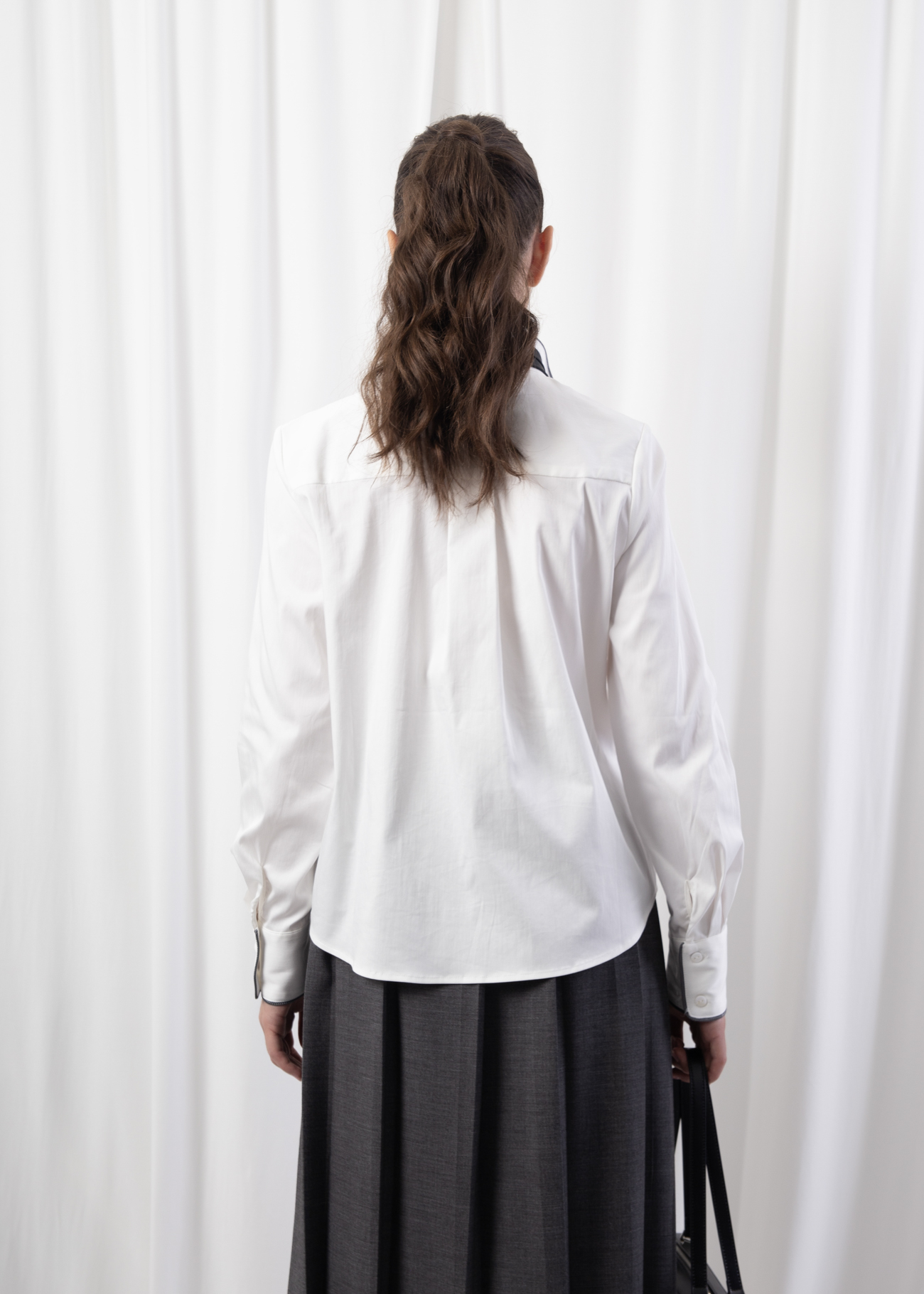 A modern reinterpretation of the classic button-down, the Japan Shirt blends sharp tailoring with a touch of refined minimalism. Crafted from a cotton-blend with stretch, it offers comfort, crispness, and versatility. Featuring a pointed collar with contrast piping details and buttoned cuffs, this shirt transitions seamlessly from boardroom to off-duty looks. Pair it with tailored trousers or pleated skirts for an effortless yet polished style statement.