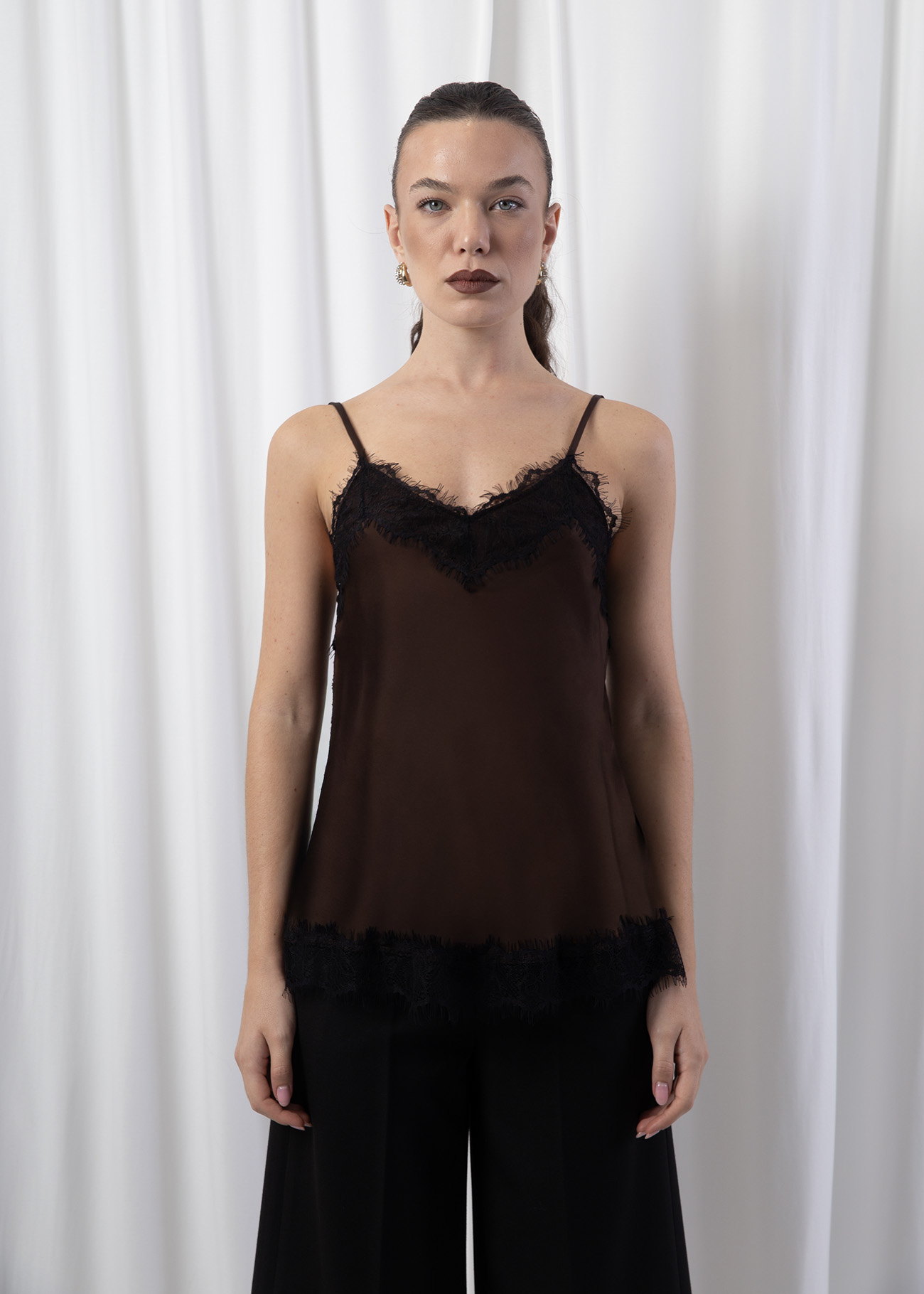 A delicate sleep top crafted from 100% viscose, designed to combine luxurious softness with refined elegance. Featuring fine adjustable straps and intricate lace trims along the neckline and hem, this piece blends comfort and femininity effortlessly. It’s lightweight and breathable fabric makes it ideal for both lounging and layering, offering a versatile addition to the modern woman’s wardrobe. Perfect for elevating everyday moments with a touch of sophistication.