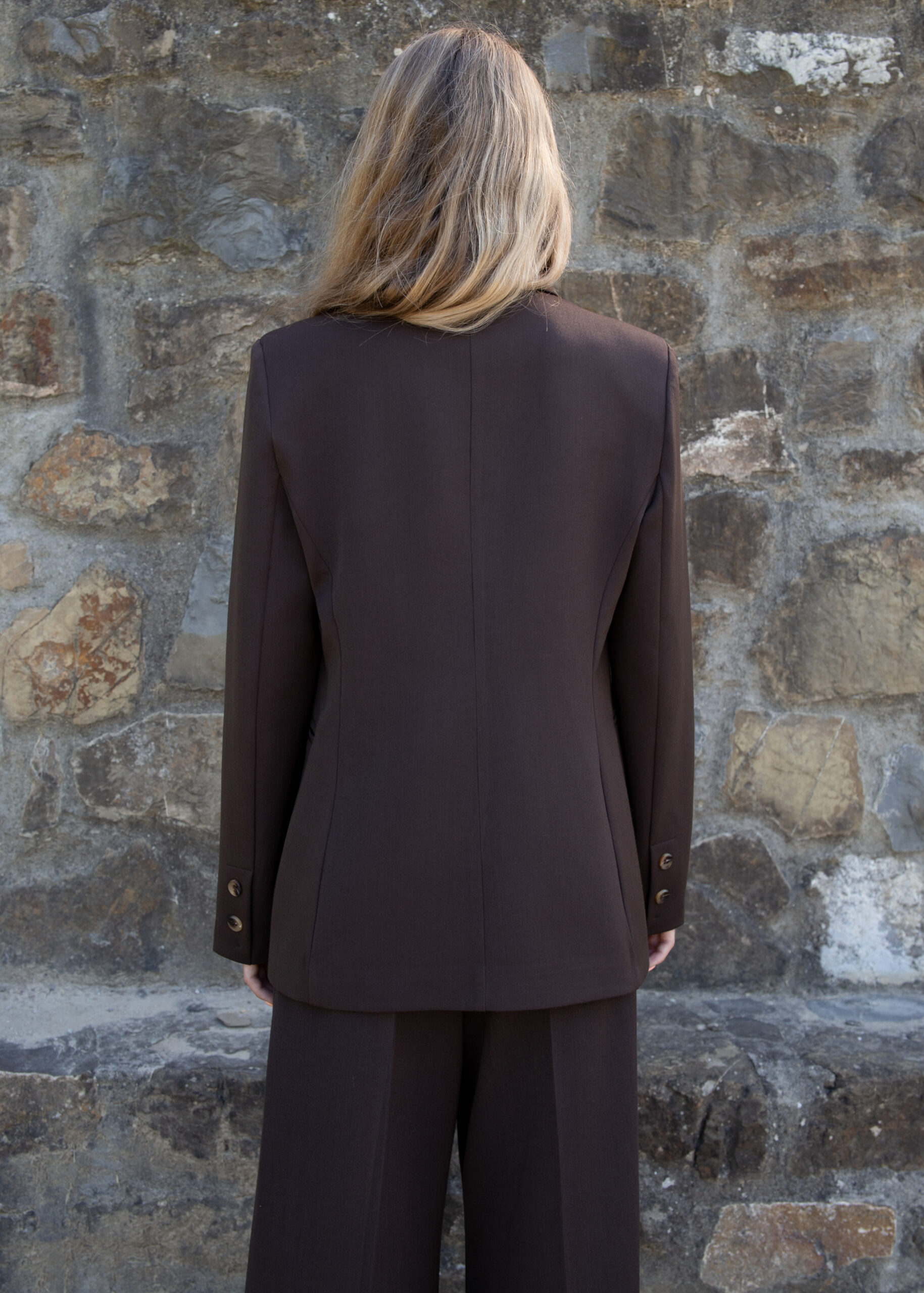 Model wearing a single-breasted tailored blazer with padded shoulders, welt pockets, and buttoned cuffs, styled outdoors against a stone wall.