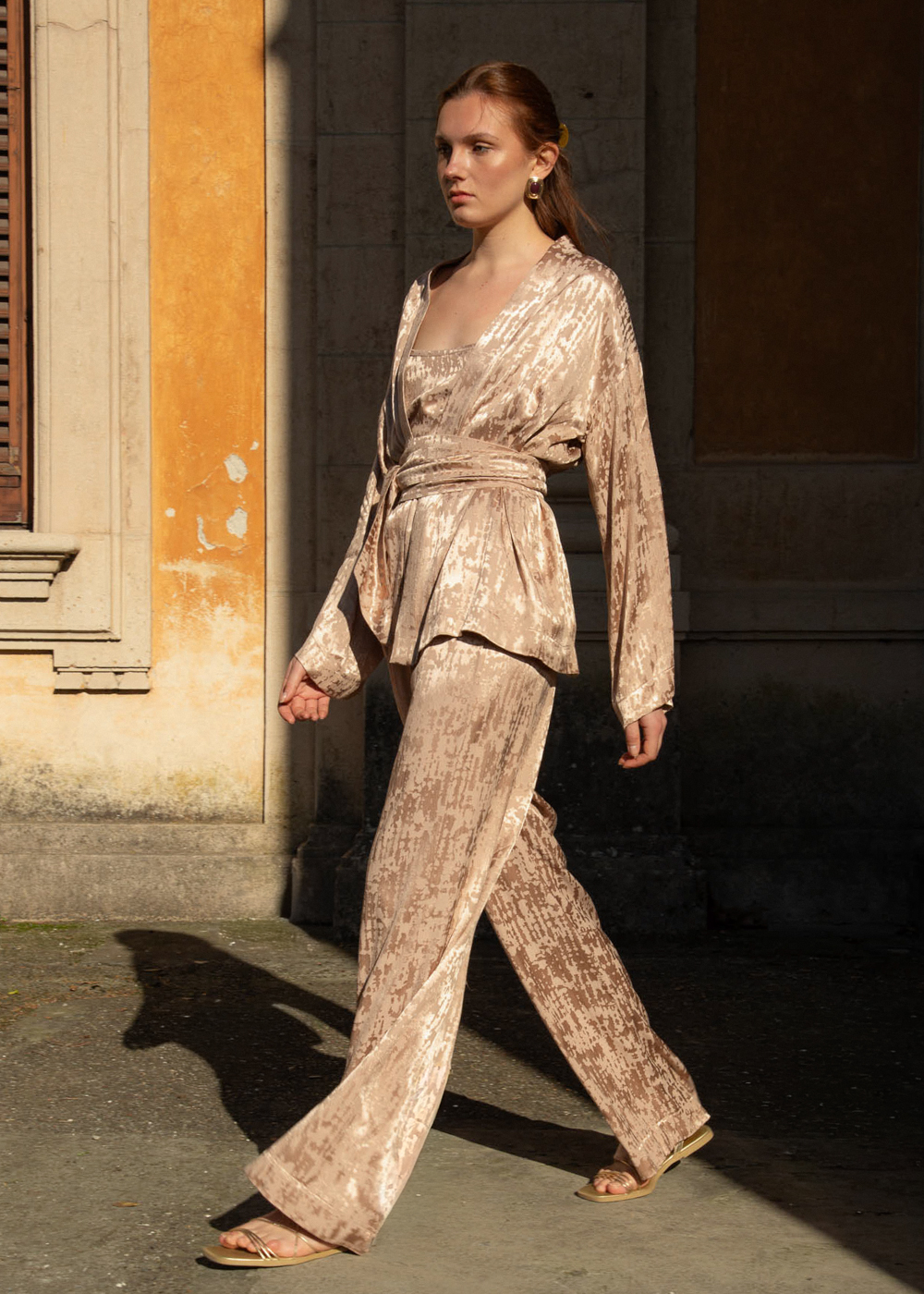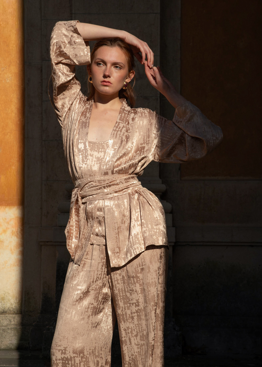 Wrap yourself in the effortless sophistication of our Luxurious Jacquard Wrap Kimono. A standout piece that blends traditional inspiration with modern Italian luxury, this kimono is defined by its rich texture and fluid, graceful movement.