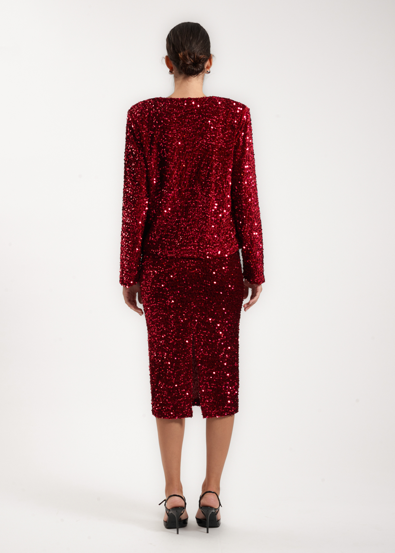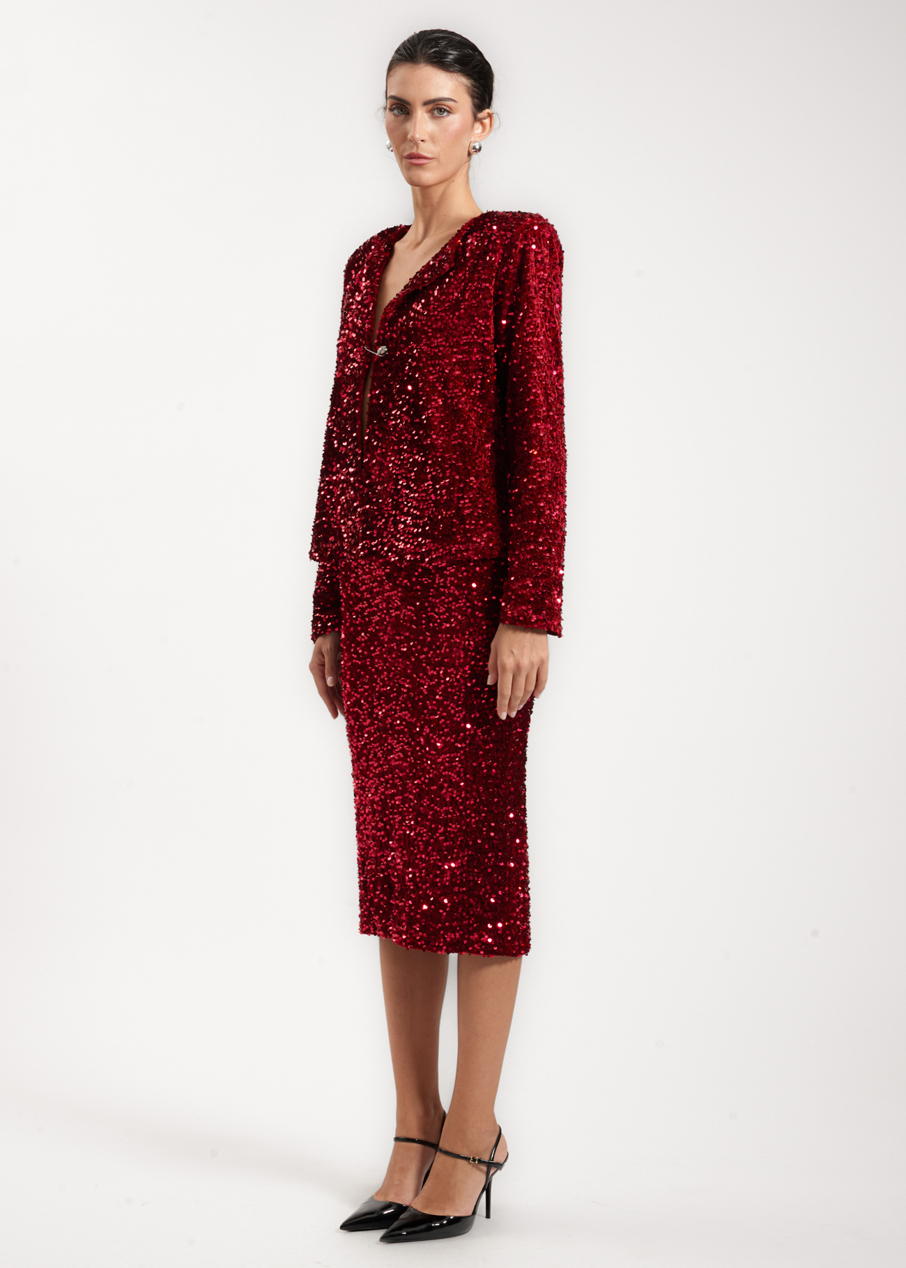 Part of the Christmas Capsule Collection, the Ruby Ensemble embodies bold glamour and refined femininity. Crafted with a stretch fit that gently embraces the body, it enhances the silhouette with effortless sophistication. The long-sleeved top is adorned with a removable jewel pin closure, adding a touch of radiance to its clean, tailored lines.Paired with a high waisted pencil skirt, this set becomes a striking statement for festive occasions yet remains timeless beyond the holiday season. The luminous strawberry red hue and all-over sequin finish catch the light with every movement, making it the ultimate piece for modern celebrations.