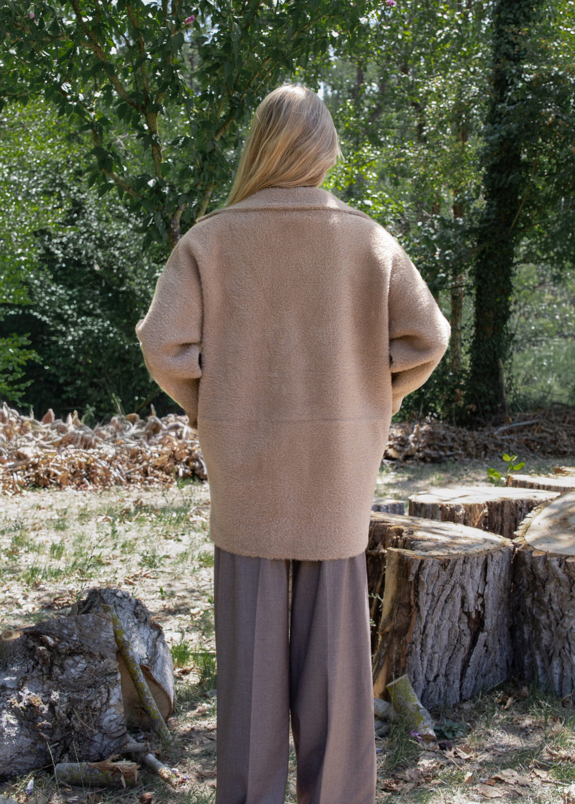 Designed with a wide notched lapel, front patch pockets, and two oversized buttons, it offers both comfort and understated elegance—ideal for layering across seasons. A versatile neutral shade makes it a wardrobe essential, pairing seamlessly with both casual and refined looks.