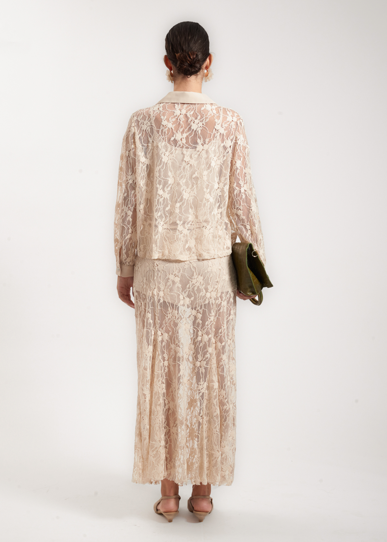 A refined two-piece ensemble that redefines elegance through texture and light. Crafted from delicate floral lace in a soft nude tone, the Diamond Button Lace Ensemble features a relaxed shirt with shimmering jewel buttons and a coordinated maxi skirt for an ethereal yet modern silhouette. Both the blouse and skirt are lined with a soft 100% viscose fabric, ensuring comfort and subtle coverage while maintaining the airy, romantic feel of the lace. Perfect for evening occasions or sophisticated daytime looks, it embodies understated glamour with a contemporary twist.